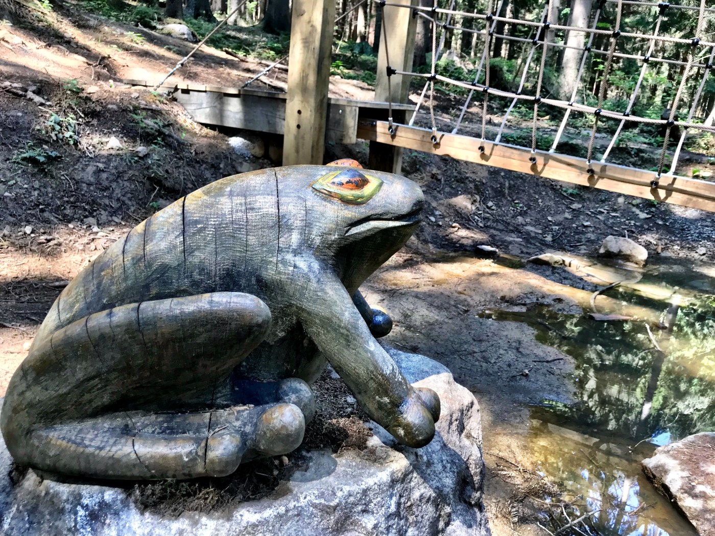 Na informačním panelu se dozví například to, že veverka v zimě nespí, a proto si musí v létě udělat zásoby. A pozor – umí sama nasušit i houby. A díky tomu, že má skvělou prostorovou paměť (jééé tu bych taky potřebovala 😀 ) se na houbách neztratí! Veverčí stezka děti dovede až k žabí tůni.