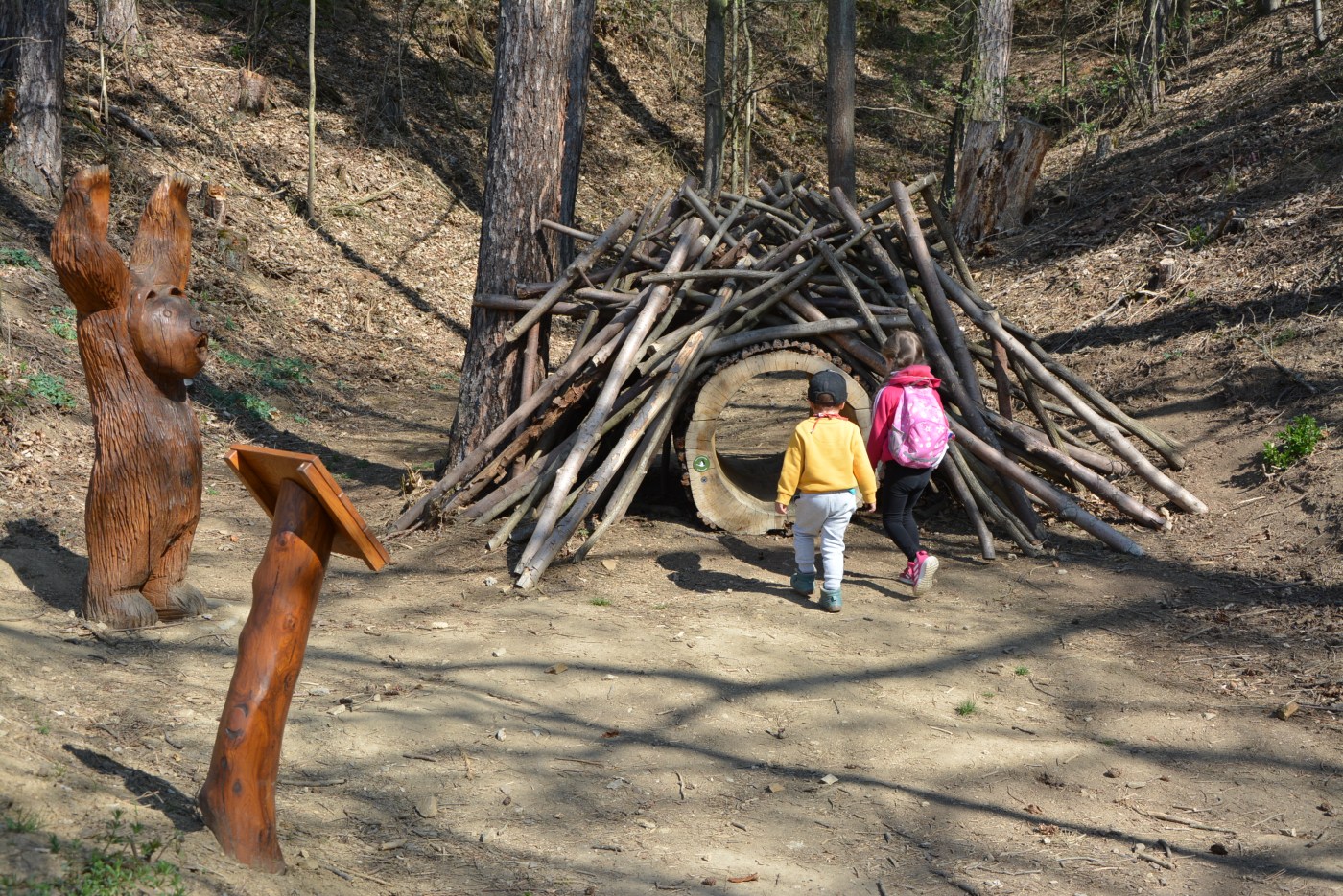 Auto jsme zaparkovali u dřevěné kopule a vydali se po schodech nahoru do lesoparku v Zátiší, kde jsou rozmístěny různé druhy hub ve zvětšené velikosti. U každé houby je interaktivní cedule, kde se dozvíte více informací.