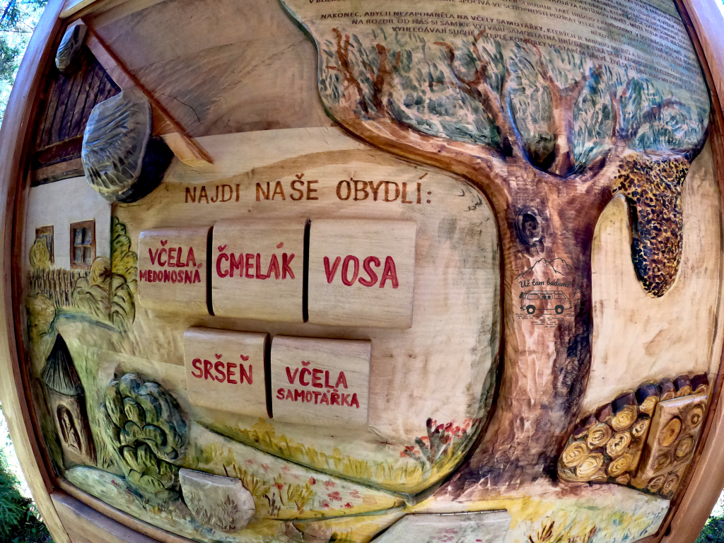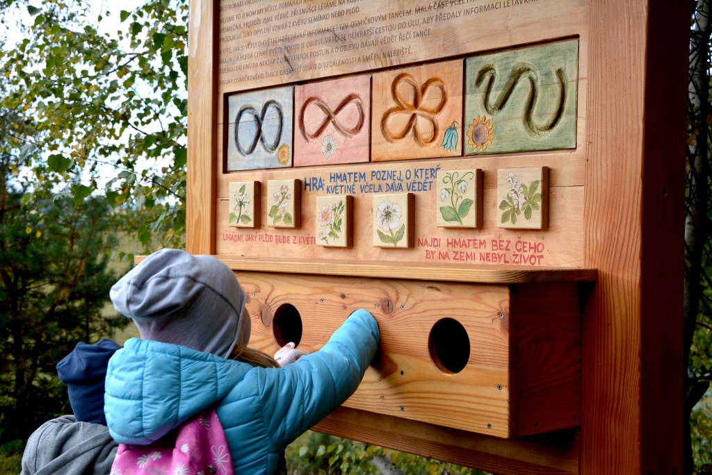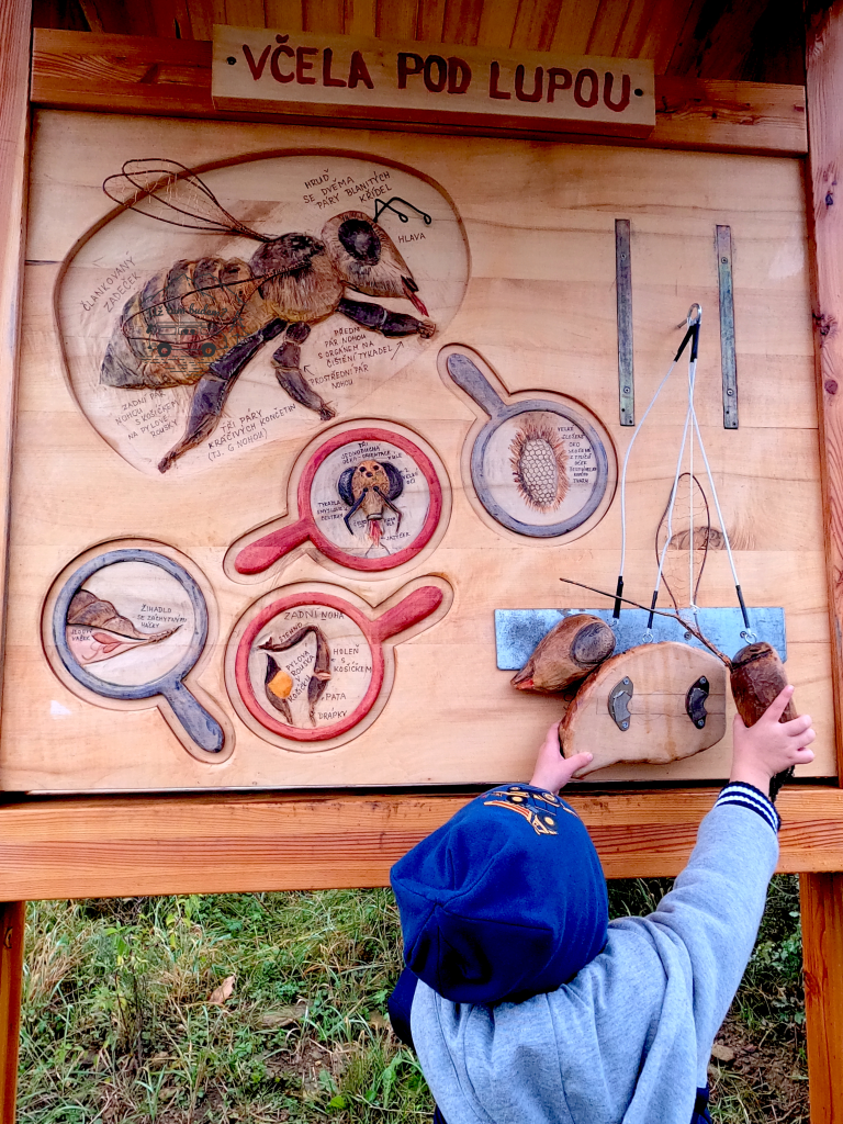 Na Včelí stezce najdete 14 zastavení. U každého zastavení jsou dřevěné cedule s interaktivními prvky. A můžu vám říct, že jsou vážně skvělé a jedny z nejhezčích, které jsme na interaktivním trasách zatím prošli!