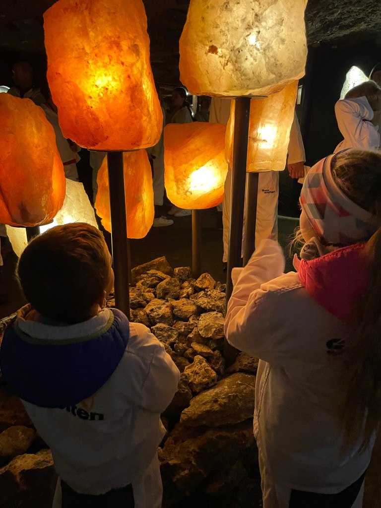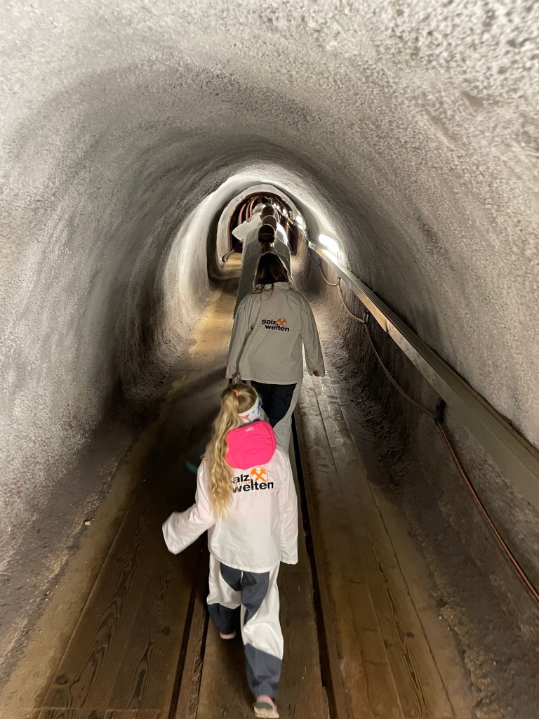 Prohlídka Solných dolů je vážně skvělá, plná zážitků a dojmů, nebudete mít šanci se nudit. Čeká vás jízda po nejdelší důlní skluzavce v Evropě, jednou vás dokonce vyfotí, tak se nezapomeňte usmívat 😀 Nechybí 3D kino ani jízda hornickým vláčkem. Prohlídka byla v AJ, ve stručnosti jsem vždy dětem přeložila, ale můžete si předem stáhnout aplikaci Salzwelten Destion Guide, která je v češtině. Vstup do dolu je pro děti od 4 let.