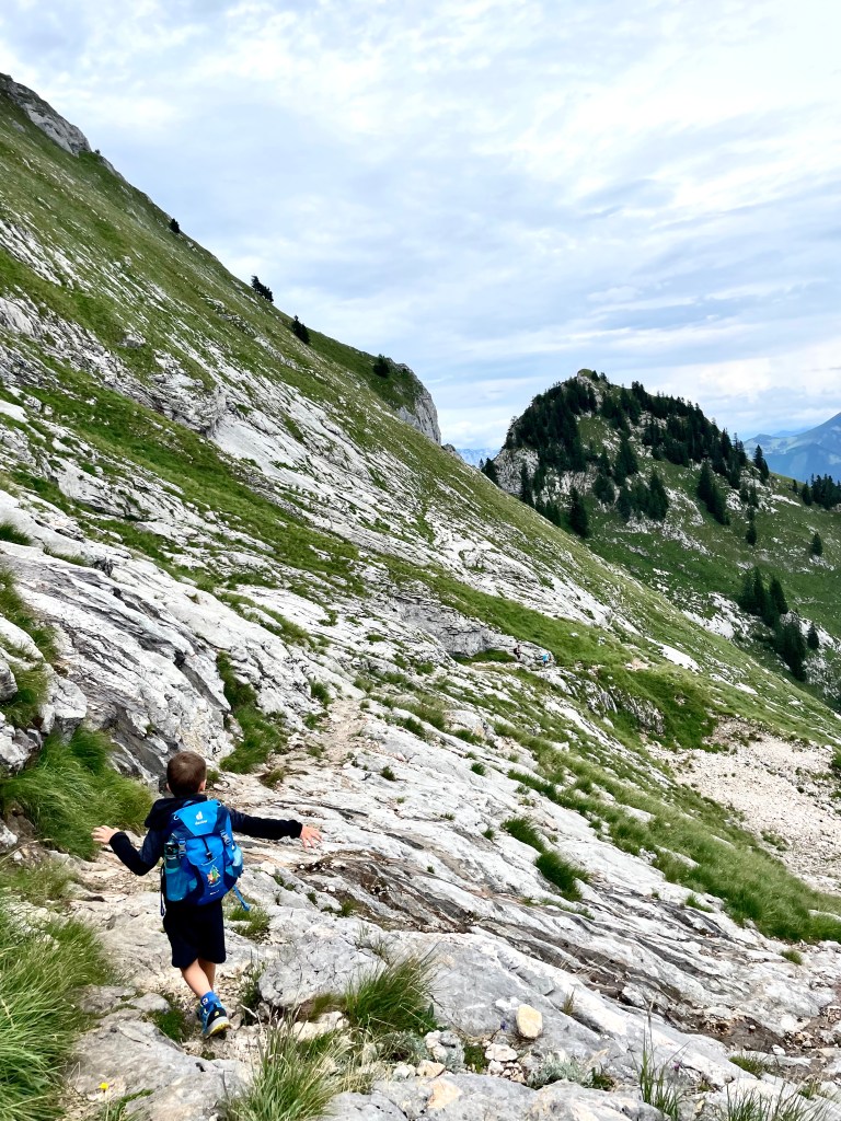 My jsme nahoru vyjeli zubačkou, což byl pro nás i děti docela zážitek díky prudkému převýšení, a dolů jsme se vydali po svých alpskou cestou. Tato cesta je náročnější, poměrně strmá, vede přes hladké skalní stěny Wetterloch. Cesta je jištěná pomocí ocelových lan a pro děti to byl velký zážitek. Na konci na sebe byli náležitě pyšní, že to dali 🙂 Druhá polovina trasy už nebyla nikterak zajímavá, vedla lesní cestou plnou kamenů a kořenů a táhle se stráááášně dlouho.
