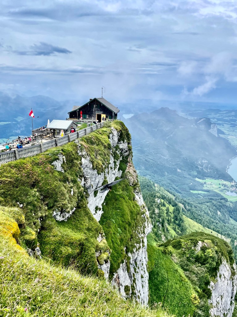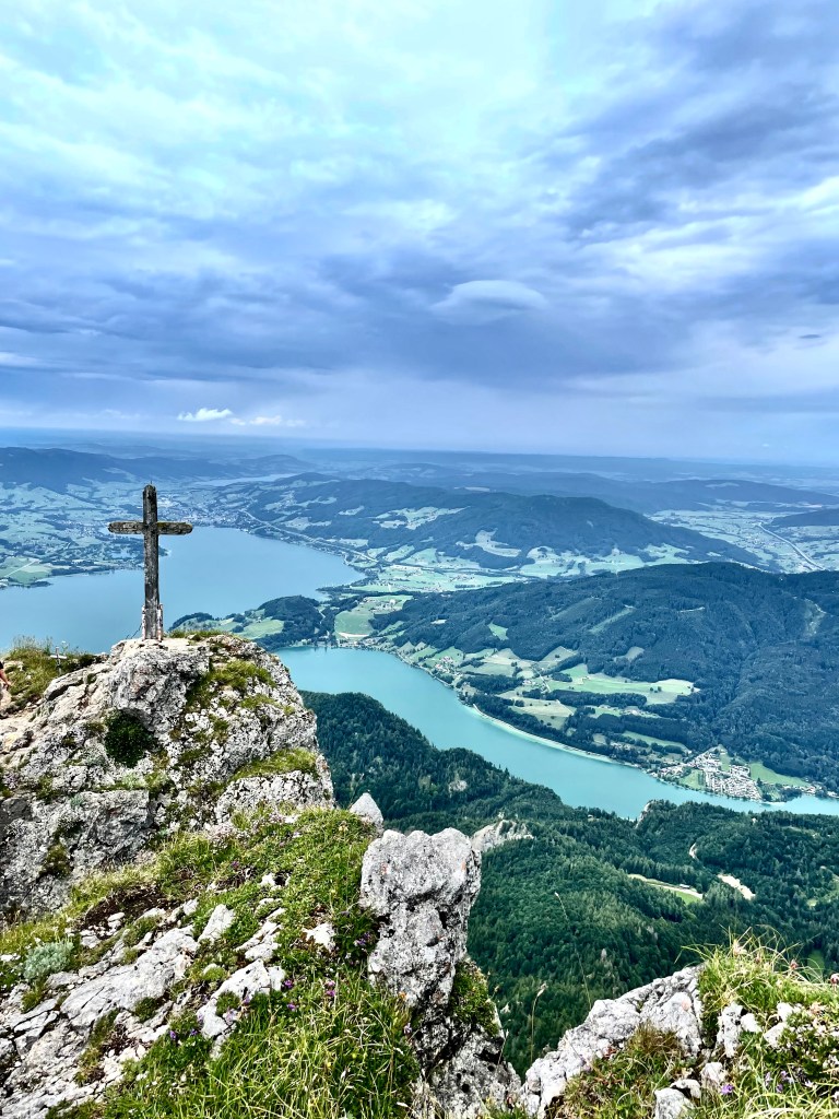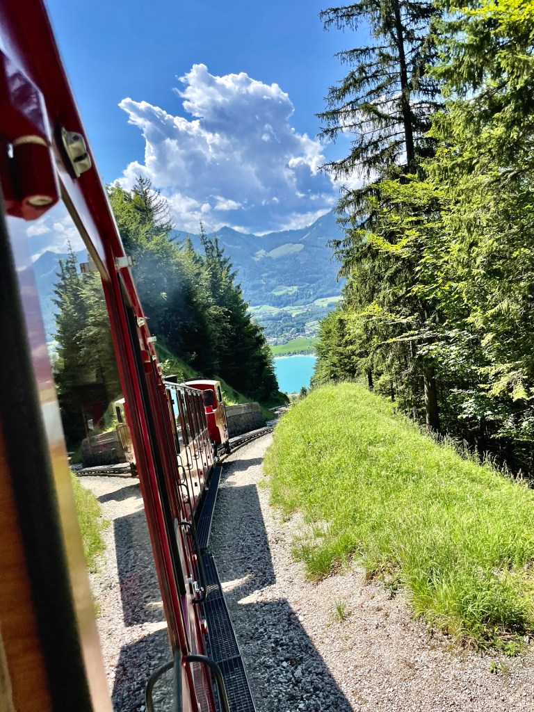 Z kempu jsme se vydali pěšky po cyklostezce do Sankt Wolfgang, odkud jsme vyjeli na vrchol Schafberg zubačkou. Doporučujeme rezervaci vstupenek online, ušetříte si tak spoustu času s čekáním (kvůli kapacitě je nutné rezervovat na přesný čas). Rezervace je možná tady, je možné spojit i s plavbou po jezeře. Ceny jsou teda docela vysoké, ale za to, co vás čeká nahoře, to rozhodně stojí. Výhledy jsou fantastické, na vrcholu uvidíte pět velkých jezer Solné Komory, jen je třeba vytipovat dopředu počasí a vyrazit za jasné oblohy.