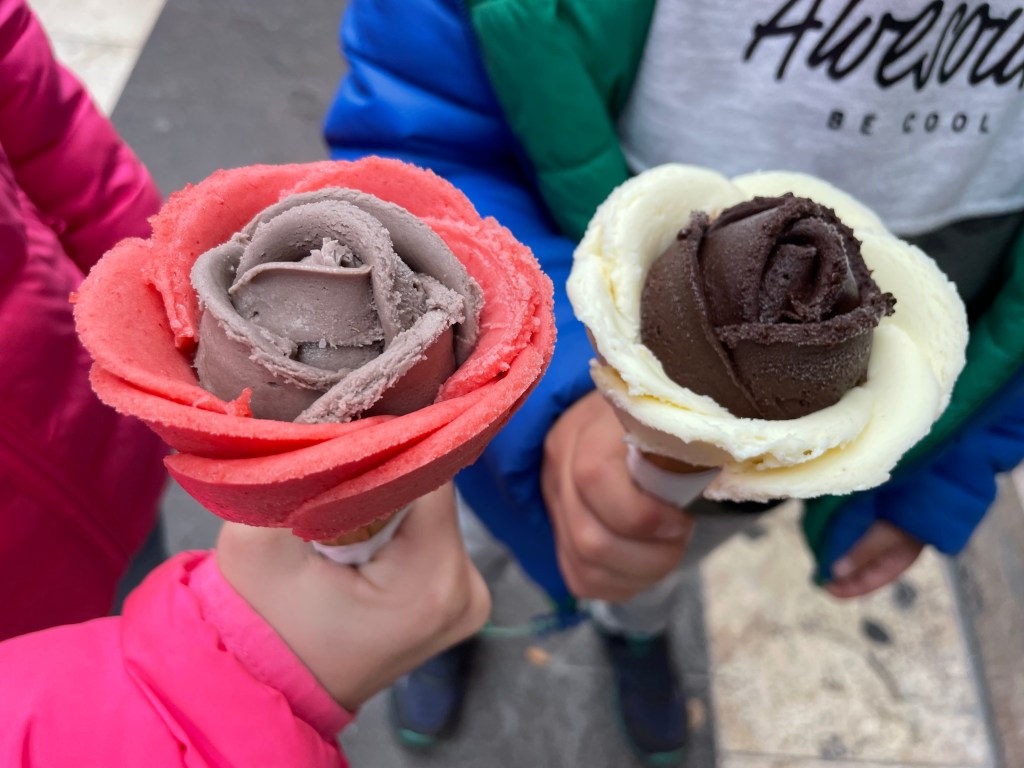 Gelarto Rosa. Vyhlášená zmrzlina ve tvaru růže, která stojí za to.Vybírat můžete ze spoustu příchutí.