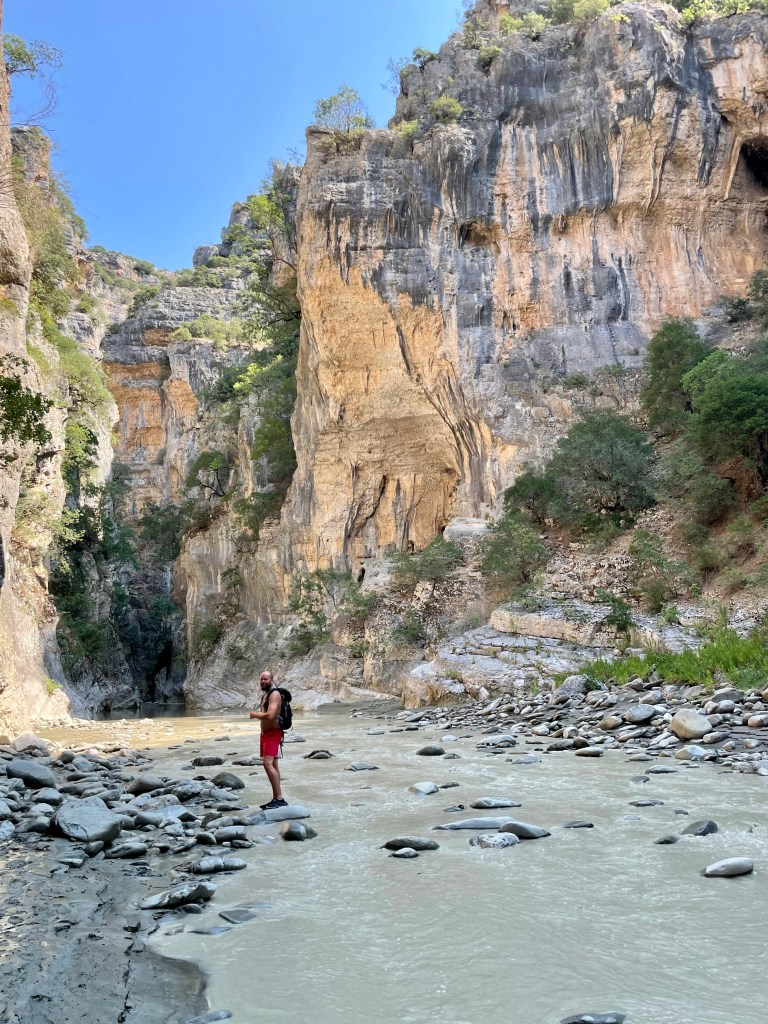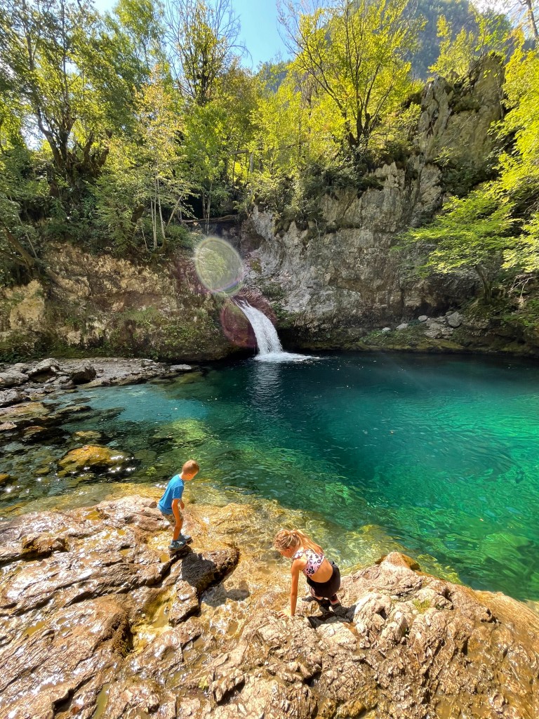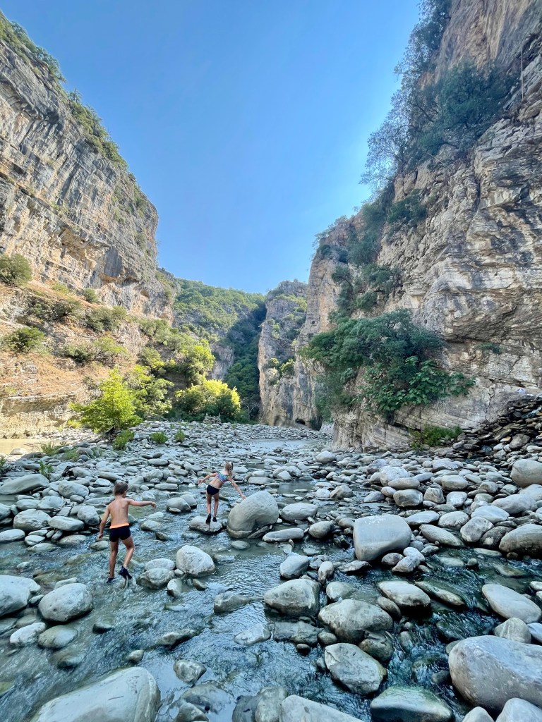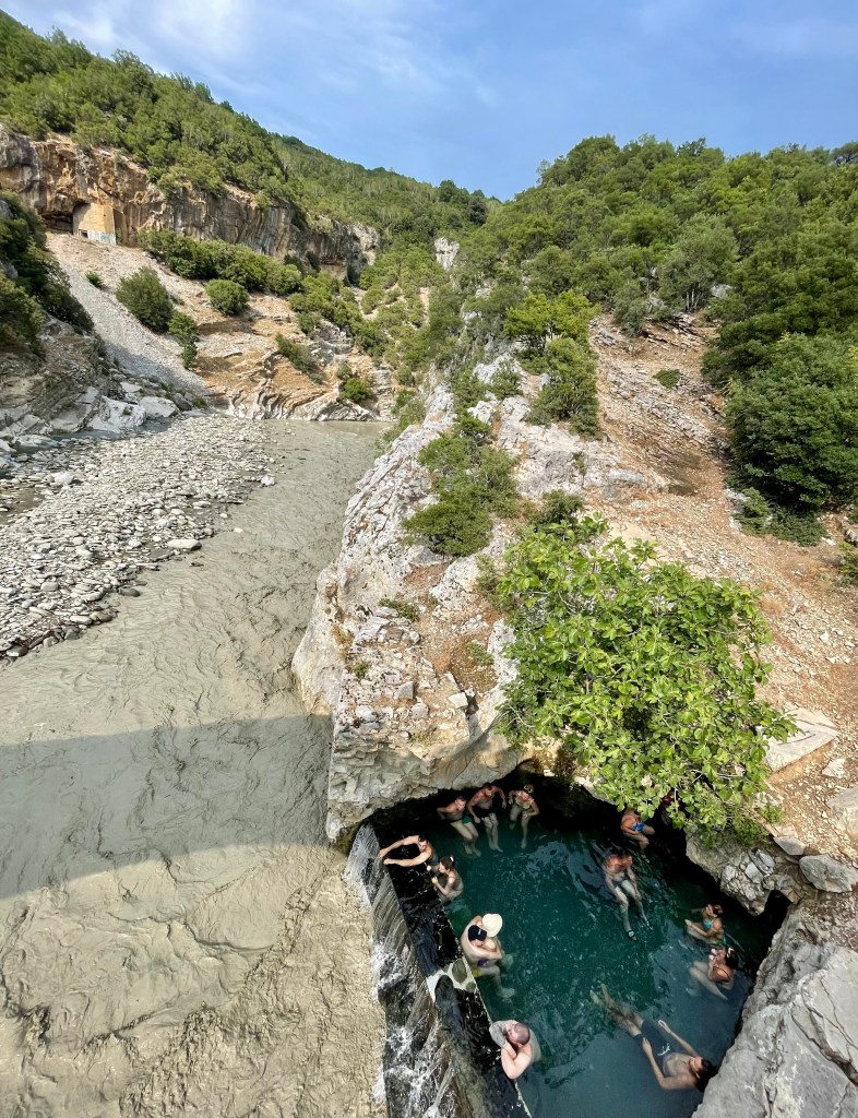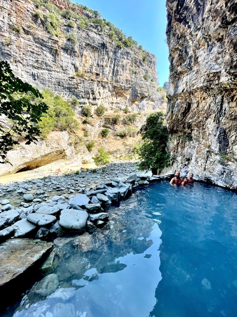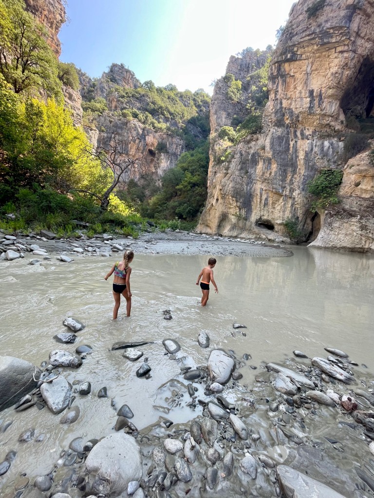 My jsme se vydali na dobrodružnou výpravu do kaňonu a byl to zážitek, na který budou děti (i my) dlouho vzpomínat. Po chvíli brodění v bahně a přeskakování kamenů jsme dorazili k termálním jezírkům a sotva jsme se smočili, už nám Albánci ruce/nohy vysvětlovali že “not good for children”. Nicméně naše děti stejně léčebné účinky termálních jezírek nikterak neocenily, protože smrad, sliz, klouzající kameny… 😀
