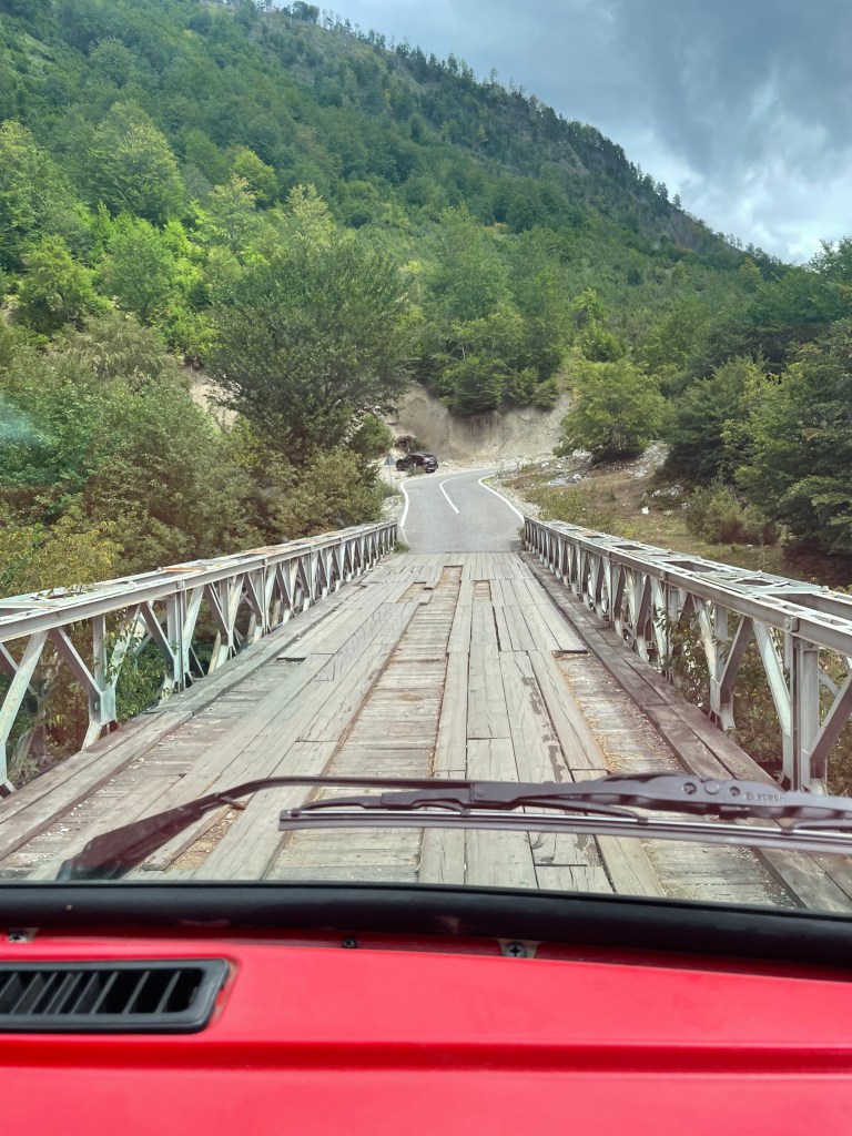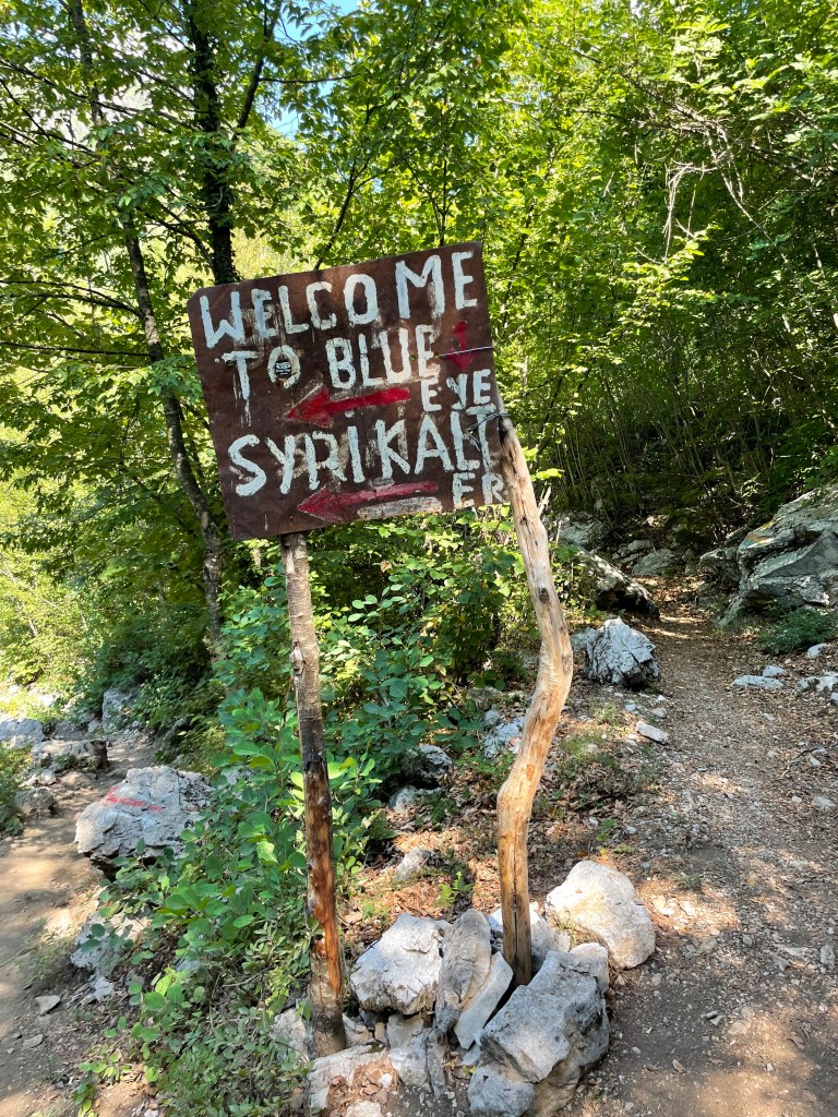 Druhý den jsme vyjeli k Blue Eye – vodní pramen a přírodní úkaz, který připomíná modré oko. Pokud máte 4×4, nechá se vyjet až těsně pod. Byla to ale dost o nervy 🙂 Případně můžete auto nechat v Nderlysaj a k Blue Eye dojít pěšky (cca 40 minut). Stezka k Blue Eye je prošlapaná, ale jak už je v Albánii zvykem, není moc dobře značena.