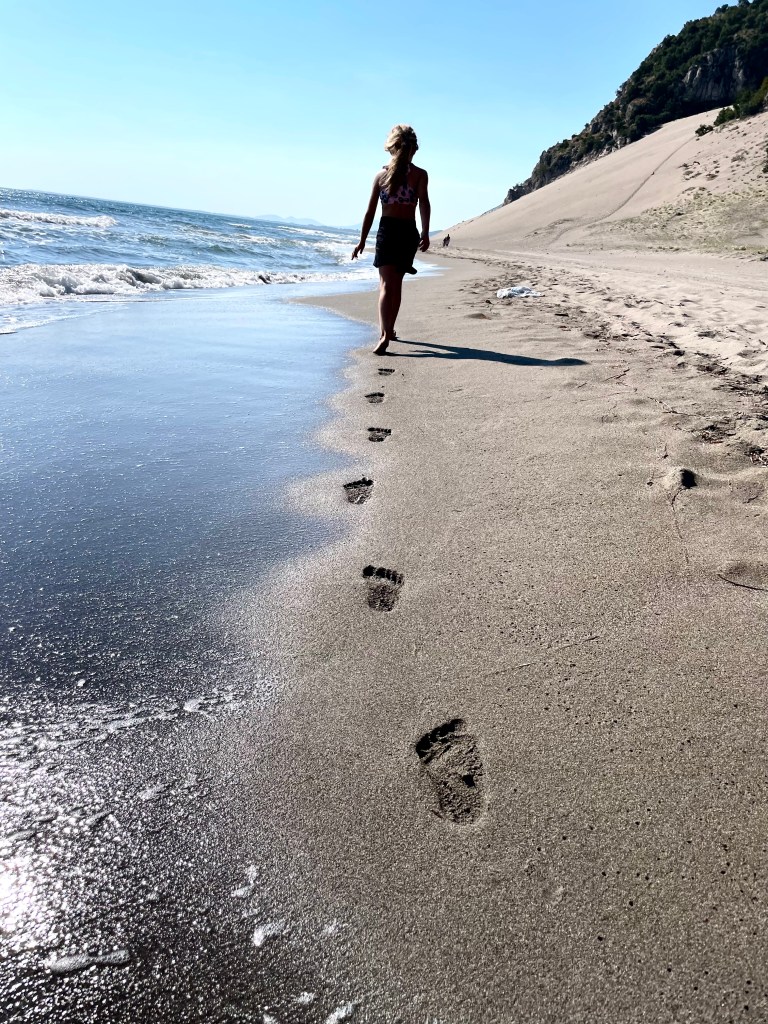 Doporučujeme si vzít deku a slunečník, pokud o kus popojdete, budete mít pláž sami pro sebe. A kdo má 4×4, toho potěší, že přímo u dun můžete kempovat. My jsme to měli původně v plánu, ale když jsme viděli, jak se auta snaží dostat z písku a přitom se zakopávají čím dál hlouběji, raději jsme to vzdali 🙂